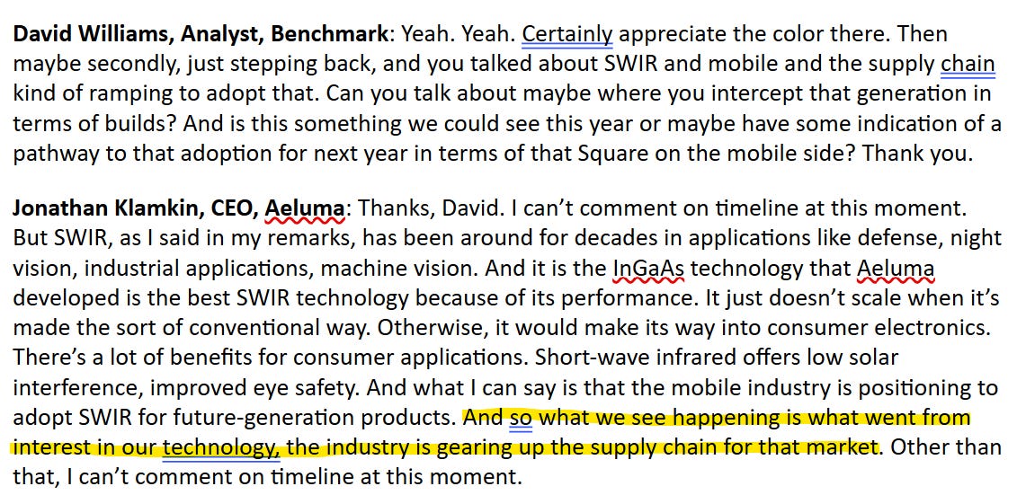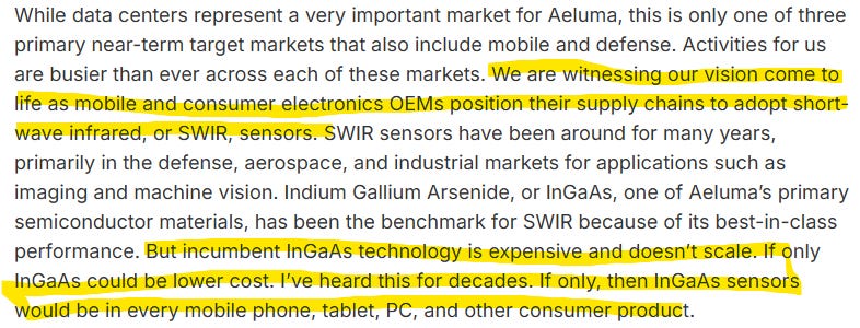 Is Aeluma the reason that the supply chains are being positioned to adopt SWIR? Is it because those 20 Apple engineers following ALMU have come to the conclusion that ALMU can scale SWIR sensors for the mass market? Cause or effect? Let’s parse on.